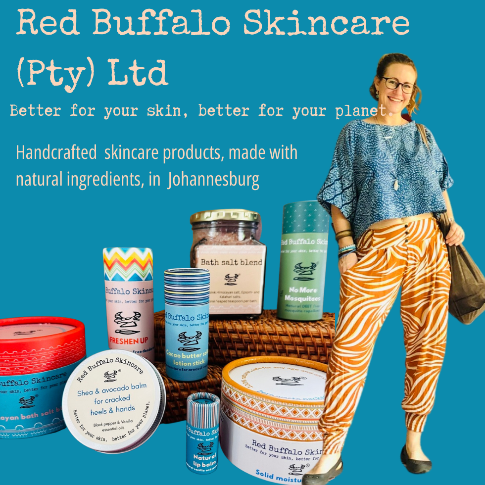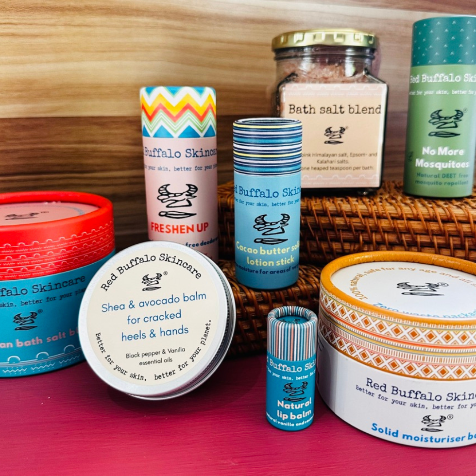 Word spread and Corlie soon started making the lotion bars for friends and the range quickly grew. Today, Red Buffalo Skincare consists of 8 hydrating products made with a combination of waxes, oils and butters. The range comprises of lip balms, natural deodorants, mosquito repellents, solid moisturising bars and cacao lotion sticks, heel scrubs and balms and Himalayan bath salts.