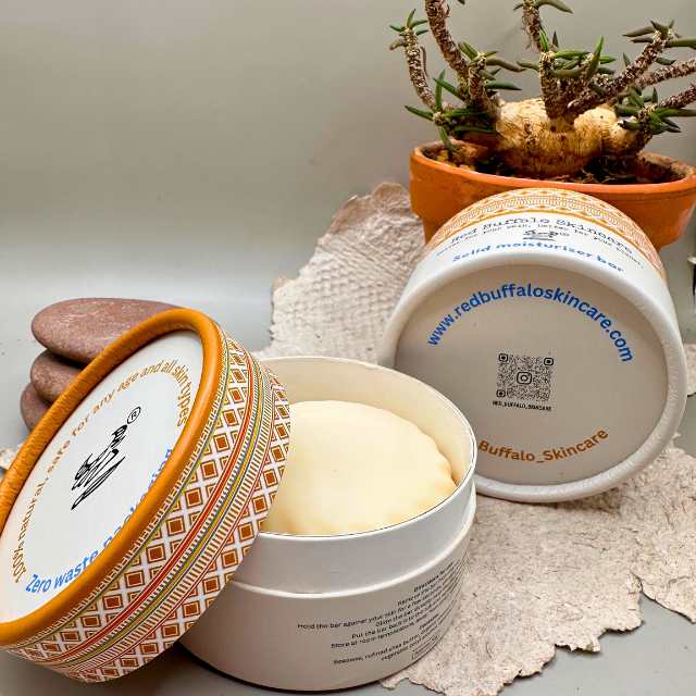 A moisturiser bar is a solid block of lotion, used for moisturising skin as part of your daily skin care program. My moisturiser bars are made with natural ingredients that stay solid at room temperature, but melt a little from body heat, making it easy to apply the moisturiser bar as needed. They weigh about 80g each and are packaged in biodegradable tubs.